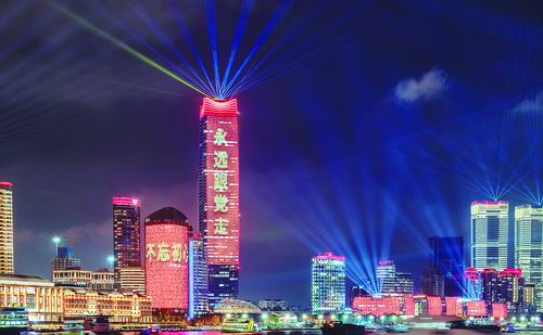 ▲上海“永远跟党走”主题光影秀点亮浦江两岸。