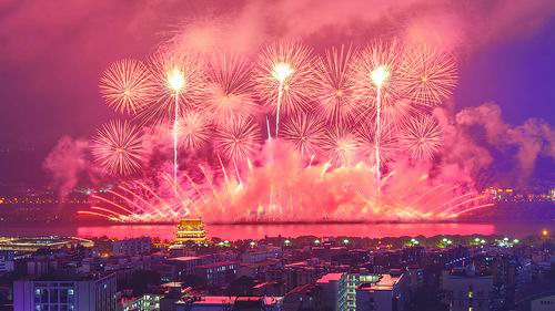 ▲长沙举行烟花燃放活动,璀璨烟花绽放橘子洲头。