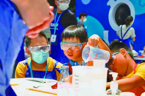 7月7日,在上海科技馆举行的“巴斯夫·小小化学家”活动中,小朋友们在做“健康防护”小实验。