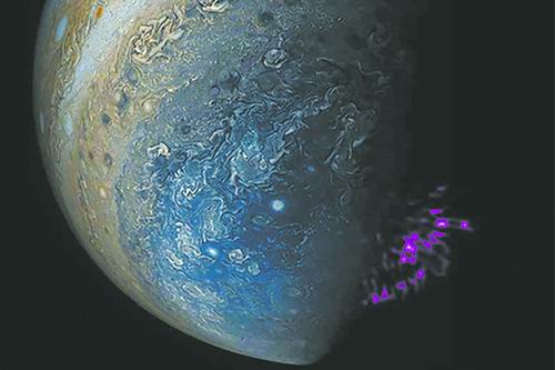 朱诺轨道飞行器和钱德拉太空望远镜拍摄的木星X射线耀斑(紫色区)。图片来源:NASA/Dunn