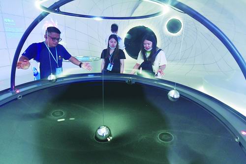 7月17日,参观者在上海天文馆体验互动展项——“引力阱”。