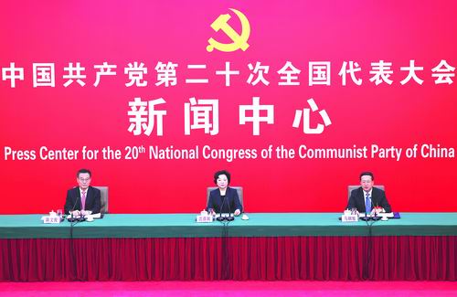 10月20日,中国共产党第二十次全国代表大会新闻中心举行记者招待会。中央对外联络部副部长沈蓓莉,外交部党委委员、副部长马朝旭围绕“习近平外交思想指引中国特色大国外交开拓前行”主题与记者交流。新华社记者 陈建力/摄