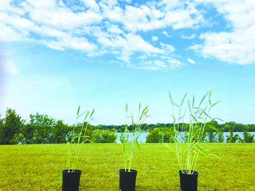 TaCol-B5转基因纯合型植株(右)比不带转基因的阴性植株(中)和非转试验的野生型植株(左)更加高大。受访者供图