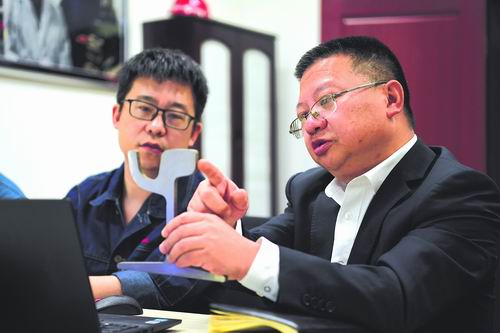 近日,在攀钢集团研究院,邹明(右)与同事一起讨论道岔设计方案。