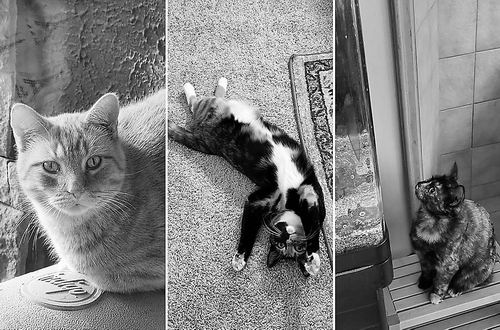 橘猫(左)携带的基因缺失导致印花布猫(中)和玳瑁猫出现橙色斑块。图片来源:LESLIE LYONS