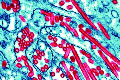 H5N1病毒颗粒的彩色透射电子显微照片。图片来源:Science Photo Library