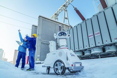 1月6日,在新疆乌鲁木齐220千伏红光变电站,一台智能机器人和运维人员正在对变电站内设备进行特殊巡检,确保电网“迎峰度冬”期间供电设备安全稳定运行。