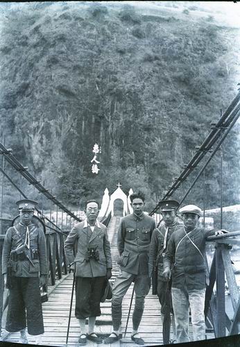 1934年12月8日,周光倬(左二)在中缅边界调查途中行进至保山潞江(怒江)惠人桥。