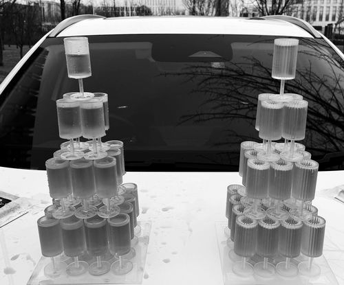 测试结束后,汽车前盖上的香槟塔状态。左侧为普通水杯,右侧为双仿生水杯。中国科学院理化技术研究所供图