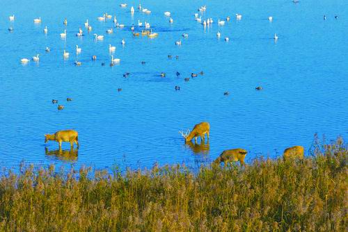 麋鹿是我国特有物种,后来由于自然变迁、气候变化、人为干扰等因素,在我国基本绝迹。1985年,我国重新从海外引进麋鹿。经过40年的保护,我国麋鹿数量由最初的77头扩展到1.5万头,其中野生麋鹿超6000头,形成了世界上规模最大的野生麋鹿种群。图为在石首天鹅洲湿地麋鹿国家级自然保护区内,麋鹿和小天鹅共享冬日暖阳。