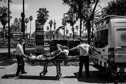 2022年,西班牙巴塞罗那热浪期间,医护人员正在帮助一名中暑患者。图片来源:Angel Garcia/Bloomberg