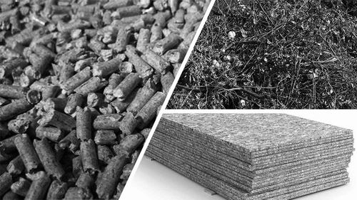 ▲以棉花秸秆原料生产的生物质颗粒和刨花板。