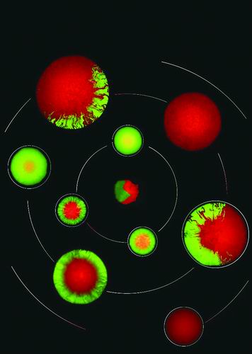 工程改造细胞切换红绿两种状态,并通过“基因-细胞-群体”跨层次调控,演化出斑图复杂性。科研团队供图