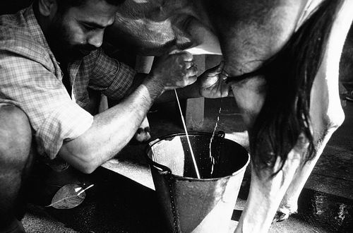 一名印度男子在挤牛奶。图片来源:STUART FREEDMAN/IN PICTURES LTD.