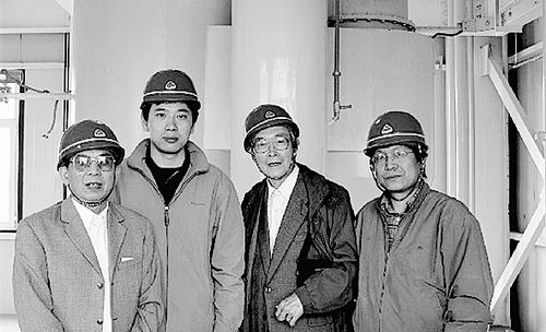 呼和浩特煤系高岭土中试车间合影(从左至右为李佑楚、王维、郭慕孙、卢旭晨)。
