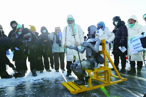 图为机器人坐在爬犁上挥动雪杖,在冰面上奋力滑行。图片来源:张瑶/中新社/视觉中国