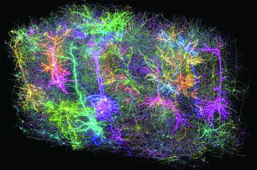小鼠脑组织重建的1000多个脑细胞渲染图。