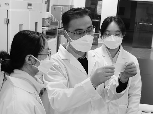 左迎峰(中)和团队成员讨论竹青薄膜封装工艺。王昊昊/摄
