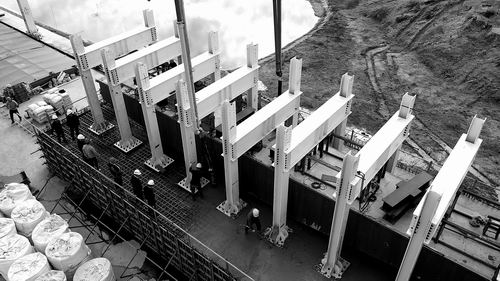 图中灰色船状设备是混凝土盖梁外壳。中交二航局供图