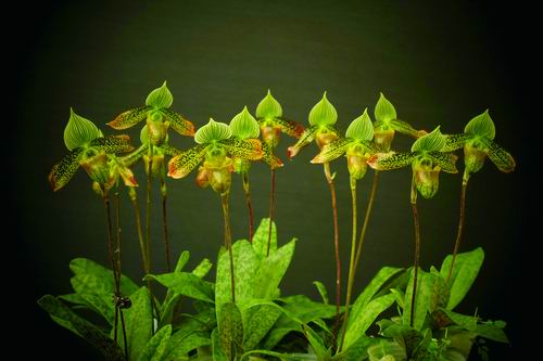 “春韵兜兰”是以麻栗坡兜兰为母本、白花兜兰为父本进行杂交,再经无菌播种繁殖而成的杂交一代品种。它长势强健,花期恰逢春节前后,花朵硕大且散发宜人香味。“秀彩兜兰”则以我国西藏的秀丽兜兰为母本、云南的彩云兜兰为父本进行杂交,经无菌播种选育而成。它于1~2月开花,单花观赏期长达50多天。