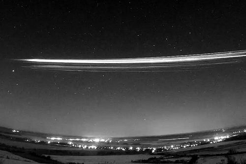 一张30秒长曝光照片,记录了2025年2月19日,一枚猎鹰9号火箭第二级在德国柏林上空重返大气层的画面。图片来源:Gerd Baumgarten