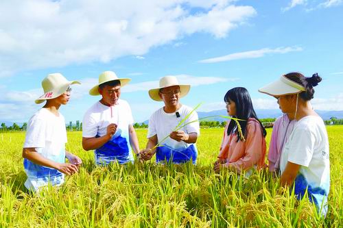 张福锁(左三)与团队师生在洱海水稻绿色生产基地查看水稻长势。受访者供图