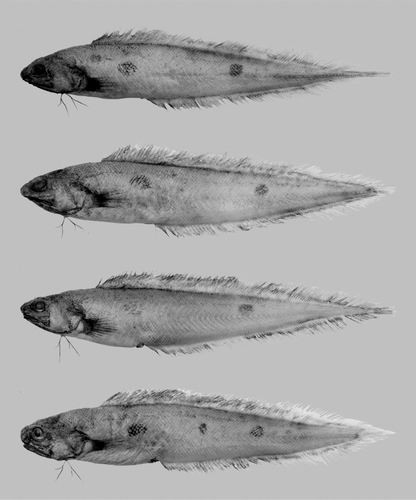 该物种最显著的鉴别特征为体侧中部具有2枚(偶见3枚)明显的黑色眼状斑,是物种确立的关键形态依据。该物种体色呈浅黄至淡棕黄色,各鳍均无斑纹与深色边缘,在鳍条数目、椎骨计数等系列性状上也呈现稳定的分类学差异。