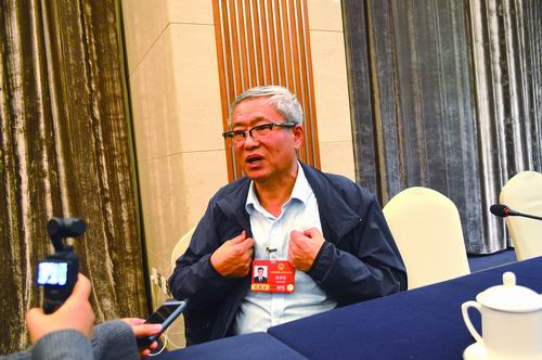 ▲全国人大代表、中国科学院院士、中国科学院长春应用化学研究所研究员陈学思面对本报记者镜头阐述观点。赵广立/摄