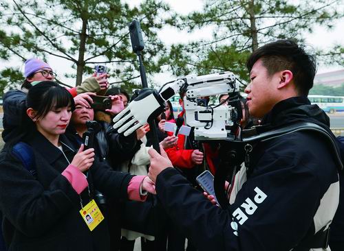 ▲一名肩扛机械手的记者在人民大会堂外接受采访。他可通过手机界面触控精准控制机械手握持话筒、全景相机等设备,拓展拍摄视角与活动空间。图片来源:视觉中国