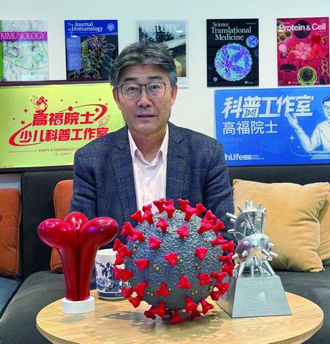 科普不仅是写书、作报告,也可以融汇在科研中。他和团队发表的国际期刊论文封面,就常融入中国风的科普元素。“去年,美国微生物学会《病毒学期刊》发布的12期杂志中,有3期封面来自我们实验室。”高福指着期刊封面墙举例说,爷爷带着孙子下“中国象棋”,意指流感病毒与宿主细胞受体之间的分子博弈;在“中国红”的剪纸图中,中间的冠状病毒和周围的各种动物形象地呈现了病毒和宿主之间的关系。通过这些“创意”,高福希望将中国元素与科研成果相结合,实现科普与文化双重传播。