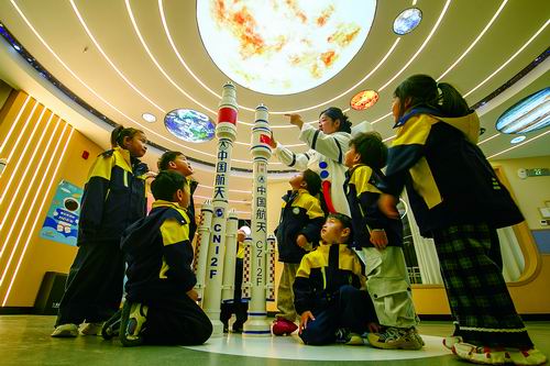 图为河南商丘一家幼儿园的老师在主题科普活动现场为小朋友讲解运载火箭模型。图片来源:视觉中国